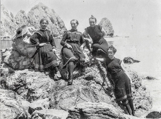 Next to me is a photo album open to a page with a large black and white photo of four women at the beach at Catalina Island outside of Los Angeles. The ‘swimsuits’ are long black dresses. The date of the photograph is documented as the late 1890’s.