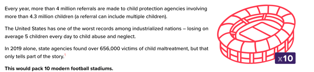 In 2019, the United States, a report of child abuse was made every ten seconds.